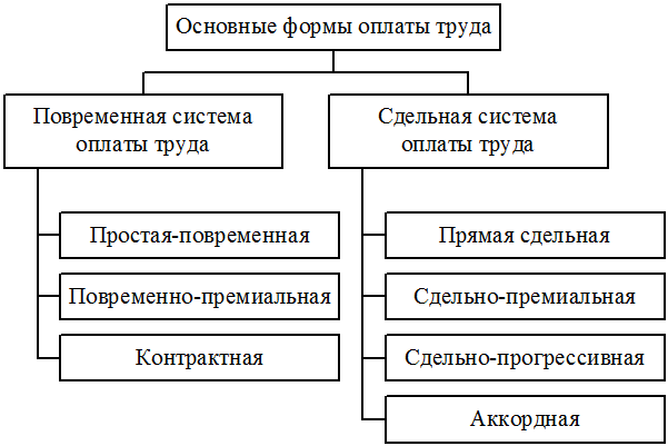 Повременная форма имеет простую повременную и повременно-премиальную системы оплаты труда. Сдельная: прямую сдельную, сдельно-премиальную, аккордную, косвенно-сдельную, сдельно-прогрессивную и коллективную (бригадную), сдельно-премиальную или повременно-премиальную системы оплаты труда.
