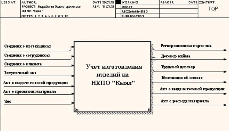 Глобальный бизнес-процесс «Учет изготовления изделий на НХПО “Кыял”» с учетом всех входных и выходных данных