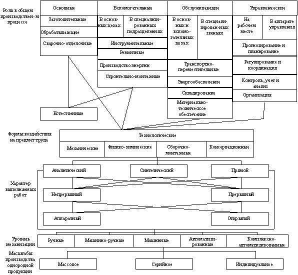 В условиях автоматизированного, автоматического и гибкого интегрированного производств вспомогательные и обслуживающие процессы в той или иной степени объединяются с основными и становятся неотъемлемой частью процессов производства продукции, что будет рассмотрено более подробно позже.