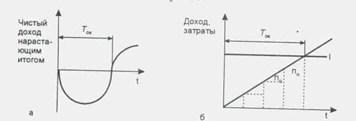 Проект считается привлекательным при меньшем периоде его окупаемости и быстром возвращении инвестору его начальных вложений. Графическая интерпретация показателя периода окупаемости представлена на рис. 4 а, где приведена динамика изменения чистого кумулятивного дохода по инновационному проекту. Для проектов, характеризующихся постоянным по величине и равномерно поступающим чистым доходом П0 и единовременными капитальными вложениями в проект I, период окупаемости Ток (см. рис. 3б), определяется по формуле