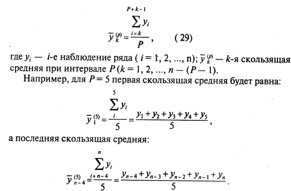 Метод скользящих средних позволяет отвлечься от случайных колебаний временного ряда, что достигается путем замены значений внутри выбранного интервала средней арифметической величиной. Интервал, величина которого остается постоянной, постепенно сдвигается на одно наблюдение. Величина интервала скольжения Р может принимать любое значение от минимального (Р= 2) до максимального (Р= N— 1, где N— длина рассматриваемого временного ряда). Сглаженный ряд короче первоначального на Р— 1 наблюдение.