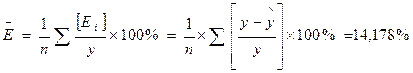 В среднем расчетные значения ý для линейной модели отличаются от фактических значений на 14,178%.