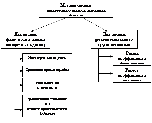 Величина износа основных фондов может быть определена по разным характеристикам: мерой сближения сроков фактической их службы и полезного использования, показателями уменьшения стоимости средств труда и уровнем возмещения их стоимости. Соответственно, для оценки физического износа основных фондов применяются различные методы: экспертных оценок; сравнения сроков службы; уменьшения стоимости по времени эксплуатации; уменьшения стоимости по производительности (объему выполняемых работ) и расчета коэффициентов физического износа и годности основных фондов. Причем, область применения данных методов различна: одни из них используются для определения физического износа конкретных единиц основных фондов, а другие позволяют оценивать физический износ по основным производственным фондам в целом либо по их группам (рис.1).