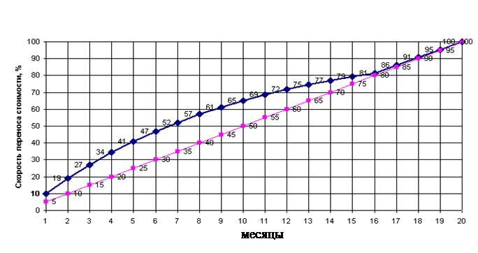 Расчеты, выполненные по трем вариантам, позволяют сделать вывод, что скорость переноса амортизации не зависят от срока полезного использования. Для всех вариантов графики получены аналогичные, что позволяет построить общий график и таблицу переноса амортизации. В целом можно сделать вывод, что нелинейный метод достаточно эффективен с точки зрения "быстрого" уменьшения налоговых обязательств. Так, например, по истечении половины срока полезного использования по нелинейному методу в расходах будет учтено 65 процентов первоначальной стоимости против 50 по линейному методу.