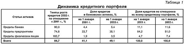 Как видно,темпы роста объема кредитного портфеля банков за истекший период составили 84,7%и более чем в полтора раза превысили темпы роста совокупных банковских активов. Удельный вес кредитных операций по отношению к совокупным банковским активам возрос с 41,1 практически до почти 50%.При этом доля кредитов,предоставленных в рублях,выросла незначительно (примерно до 70%по сравнению с 62%на 1 января 2001 г.). Активизация кредитных операций банков обусловлена следующими факторами:
