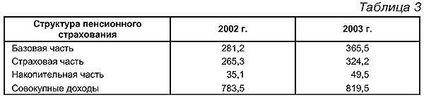 Деятельность по обеспечению пенсионного страхова ния осуществляется Пенсионным фондом России (ПФР) (взносы по формированию базовой части сначала поступают в федеральный бюджет, а далее подлежат передаче ПФР).Структура доходов ПФР 2002 и 2003 гг.представлена в табл.3 (в млрд руб.): В соответствии с законом о негосударственных пенсионных фондах (НПФ)России осуществляется также негосударственное пенсионное страхование .