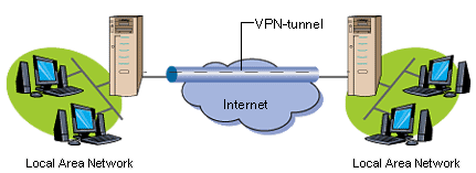 Наиболее распространенным решением является использование технологии виртуальных частных сетей (virtual private network, VPN). В этом случае обеспечивается создание логических туннелей между локальными сетями, соединенными публичной сетью. То есть два граничных устройства, принадлежащих разным локальным сетям эмулируют соединение точка-точка между собой. Обе локальные сети оказываются как бы объединенными, то есть не требуется никаких дополнительных настроек ни рабочих станций и серверов, ни других маршрутизаторов. Глобальная сеть Интернет используется в качестве магистрали виртуальной частной сети (см. рис.1).