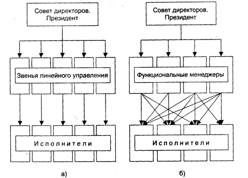 Рис. 1. Базовые структуры управления бюрократического типа: (а) линейная; (б) функциональная