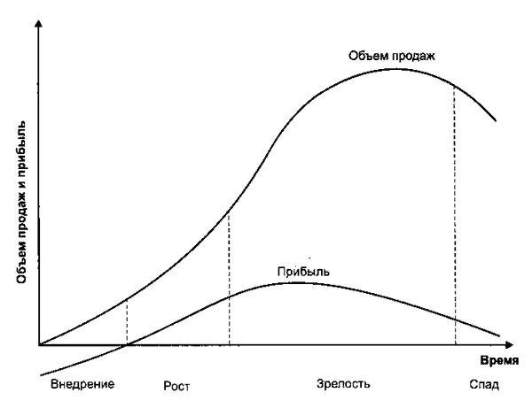 Теория жизненного цикла продукта подразделяет период эволюции спроса на четыре основные фазы: фазу внедрения, фазу