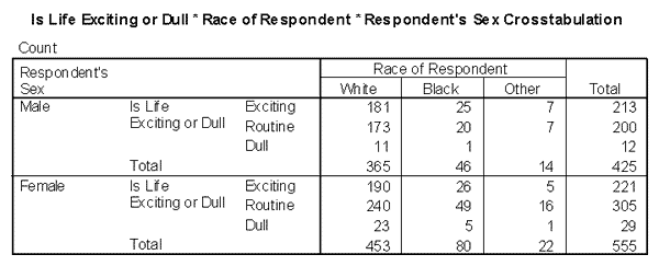 Применительно к обработке опросных листов, если выбрать строку, столбец и слой (задаваемый значением управляющей переменной), то для каждого слоя в таблице сопряженности рассчитываются соответствующие статистики. Например, если в качестве управляющей переменной используется ПОЛ (sex), то при анализе таблицы сопряженности для переменных ОТНОШЕНИЕ К ЖИЗНИ (life) и РАСА (race of respondent), результаты двумерной таблицы для женщин будут вычисляться отдельно для результатов для мужчин (рис.2.13).