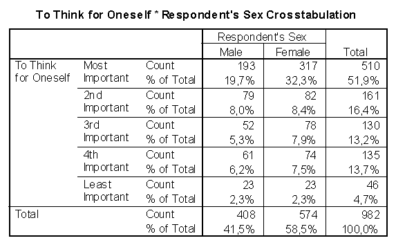 Например, насколько важна самооценка для мужчин и для женщин? Используя результаты маркетингового исследования (опроса), можно рассчитать соответствующую таблицу сопряженности. Из этой таблицы исследователь сможет узнать, например, что очень важна самооценка для 193 (19,7%) опрошенных мужчин и для 317 (32,3%) опрошенных женщин или для 510 (51,9%) опрошенных респондентов (рис. 2.14).