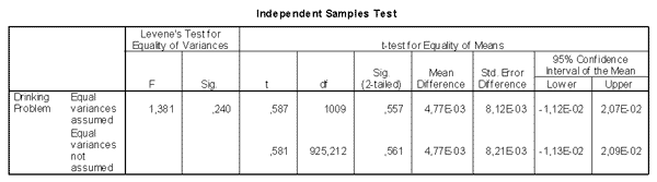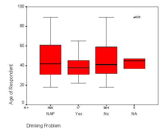 Чтобы применить t-критерий для независимых выборок, требуется, по крайней мере, одна независимая (группирующая) переменная (например, ВОЗРАСТ: до 40 лет и свыше 40 лет) и одна зависимая переменная (тестовое значение некоторого показателя например ПРОБЛЕМЫ С АЛКОГОЛЕМ). В соответствии со значениями независимой переменной данные разбиваются на две группы( рис 2.12). Можно произвести анализ этих данных с помощью t-критерия, сравнивающего среднее значение переменной ПРОБЛЕМЫ С АЛКОГОЛЕМ (Drinking Problem) для двух групп респондентов: в возрасте до 40 лет, и в возрасте свыше 40 лет. каждый респондент в соответствии с возрастом попадает только в одну группу.