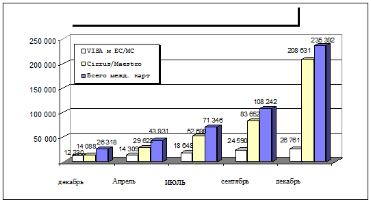 Рост числа выпущенных международных карт Сбербанком России развивается значительными темпами. Общее количество международных карт возросло за год в 14,8 раза, с 26 318 до 235 392 карт (абсолютный прирост - 209 074 шт.), из них: Visa и ЕС/МС – с 12 230 до 26 761 штук (рост в 2,7 раза/ + 14 531 шт.); Сбербанк-Cirrus/Маеstro – c 14 088 до 208 631 штук (рост в 12,1 раза / + 194 543 шт.).