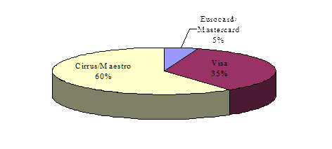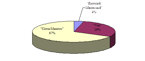 В 2000 году Сбербанк России приступил к эмиссии международных карт, привязанных к рублевому счету. В настоящий момент на долю карт Visa, ЕС/МС с рублевым счетом приходится 35,6 %. Карты Сбербанк – Сirrus/Маеstro выпускаются в основном с рублевым счетом. В 2004 году продолжилось развитие инфраструктуры приема международных карт. Кроме того, международные карты принимаются в 162 банкоматах Сбербанка России (в Москве - 136, в Санкт-Петербурге - 26 (только ЕС/МС, Cirrus/Maestro )) и в 191 торговой точке Санкт-Петербурга. Остаток средств, привлеченных на счета международных карт на 01.01.04 г. составил: валютных - 18, 6 млн. долларов США, рублевых - 141, 2 млн. рублей.