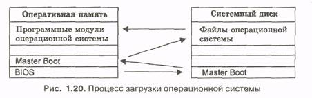 Загрузка операционной системы. После проведения самотестирования специальная программа, содержащаяся в BIOS, начинает поиск загрузчика операционной системы. Происходит поочередное обращение к имеющимся в компьютере дискам (гибким, жестким, CD-ROM) и поиск на определенном месте (в первом, так называемом загрузочном секторе диска) наличия специальной программы Master Boot (программы-загрузчика операционной системы).