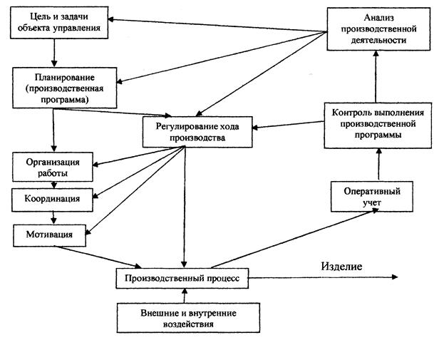 В обобщенном виде понятие о системе управления производством можно сформулировать следующим образом. Система управления производством представляет собой совокупность взаимосвязанных структурных элементов (информации, технических средств ее обработки, специалистов, отделов (бюро) по управлению, связей и отношений между ними, соответствующих функций, методов и процессов управления), обеспечивающих при их скоординированном взаимодействии реализацию производственными подразделениями поставленных целей.