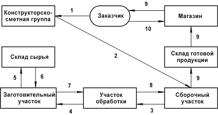 → – технологическая связь; 1 – заказ на изготовление стола; 2 – рабочие чертежи и внутризаводские цены на стол; 3 – заказ на детали с приложением чертежей и цен на детали; 4 – то же на заготовки; 5 – заказ на сырьё и комплектующие (ламинат, крепеж, фурнитуру) и цены на них; 6 – ламинат, крепеж и фурнитура; 7 – заготовки стола, крепеж, фурнитура; 8 – обработанные детали стола; 9 – изготовленный стол согласно заказа; 10 – деньги за стол согласно заказа.