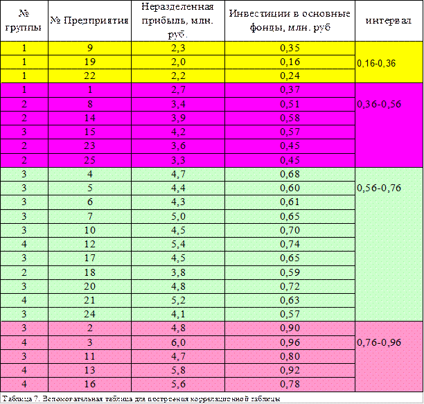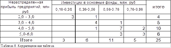Вывод. На основании данных построенной корреляционной таблицы можно сказать, что с увеличением нераспределенной прибыли средний объем инвестиций в основные фонды предприятий также увеличивается, что свидетельствует о наличии прямой корреляционной связи между указанными признаками.