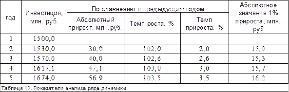 Результаты проведенных расчетов позволяют сделать следующие выводы. Наблюдается положительная динамика в течение всего периода. Она носит не скачкообразный характер, а планомерный. Это подтверждает графическое изображение динамики прибыли. Различия между двумя видами инвестиций незначительные. Ускоренный рост прибыли на предприятии можно увидеть по увеличивающемуся абсолютному значению 1% прироста. Для более глубокого анализа динамики прибыли необходимо изучить изменения составляющих ее элементов и направления этих изменений за рассматриваемый период, выявить влияние отдельных факторов.