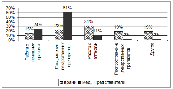 Обычно медицинский представитель продвигает одномоментно 4 - 5 новых препаратов иногда – нескольких фармакологических групп, посещая при этом врачей различных специальностей, периодически напоминая о старых, хорошо известных препаратах. В случае проведения рекламной компании все медицинские представители могут быть задействованы для продвижения рекламируемых препаратов по специальному promotion – плану фирмы. В некоторых компаниях среди медицинских представителей нет разделения труда по группам «потребителей» это аптеки и ЛПУ, в некоторых – выделены специальные группы медицинских представителей, продвигающие только госпитальные препараты, продвигающие ГЛС через стационары, клиники, профильные НИИ. Работа в этой группе считается более престижной, а медицинские представители – как правило, более квалифицированные, часто имеют научную степень кандидата медицинских наук, деловые контакты среди руководителей клиник и стационаров.