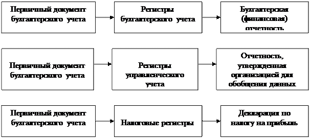Таким образом, общей информационной базой для составления регистров как финансового и управленческого, так и налогового учета является первичный учетный документ бухгалтерского учета. В различных видах финансовых, управленческих и налоговых регистров данная информация лишь группируется по различным основаниям в соответствии с задачами каждого вида учета. Областью пересечения финансового, управленческого и налогового учета является определение и распределение расходов, исчисление себестоимости готовой продукции, стоимости остатков незавершенного производства и др.
