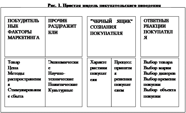 Основной вопрос: как именно реагируют потребители на резные побудительные приемы маркетинга, которые фирма может применять? Фирма, по-настоящему разобравшаяся в том, как реагируют потребители на различные характеристики товара, цены, рекламные аргументы и т. п. Именно поэтому и фирмы и научные работники тратят так много усилий на исследование зависимостей между побудительными факторами маркетинга и ответной реакцией потребителей. Отправной точкой всех этих усилий является простая модель, представленная на рис. 1. На нем показано, что побудительные факторы, маркетинга и прочие раздражители проникают в "черный ящик" сознания покупателя и вызывают определенные отклики.