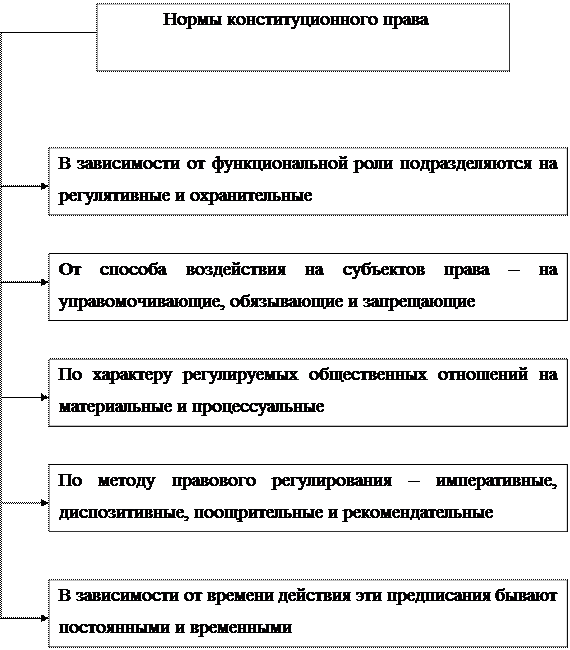 Можно провести, как это делают некоторые исследователи, разграничение норм конституционного права по различным другим критериям (по содержанию, территории действия и др.), но такая классификация лишь в небольшой степени способствует выявлению внутренней структуры права или воли законодателя в связи с ясным закреплением этой воли в самой норме.