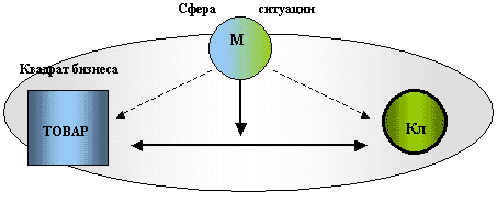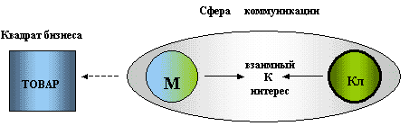 Здесь мотиватор выведен из квадрата Бизнеса. Мотиватор выступает КОНТАКТЕРОМ, заинтересованным в том, чтобы между ним и Клиентом возник взаимный интерес. А для этого он проявляет интерес к Клиенту. «Сначала я пойму, чего хочет Клиент и дам ему это, а потом он в благодарность отдаст мне то, чего хочу я» - логика подобного рода коммуникации.