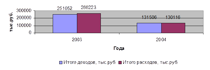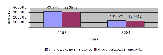 Итого расходов в 2003 г. составило 320573 тыс.руб., а в 2004 г. – 134442 тыс.руб., что на 186131 тыс.руб. меньше уровня 2003 г. и составляет 42 % уровня 2003 г.