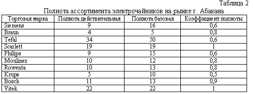 2. Проанализировать широту и полноту ассортимента электрических чайников на рынке города в целом и в разрезе отдельных торговых предприятий для оценки возможности выбора изделий, обладающих разнообразными потребительскими свойствами.