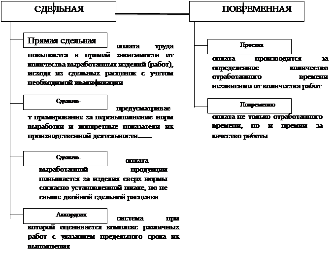 Различают денежную и не денежную формы оплаты труда. Основной является денежная форма, что обусловлено ролью денег как всеобщего эквивалента в товарно-денежных отношениях субъектов рынка. Вместе с тем, оплата труда в той или иной степени осуществляется в натурально-вещественной форме или в форме предоставления дополнительного оплачиваемого отпуска. Так, для оплаты труда при отсутствии наличных денег предприятия рассчитываются с работниками производимой продукцией, которая непосредственно потребляется ими либо продается или обменивается на другие товары. Что касается оплаты труда оплачиваемым свободным временем, то данная форма, стимулируя интенсивный и качественный труд, позволяет работнику использовать это время для учебы, отдыха или для получения дополнительного заработка.