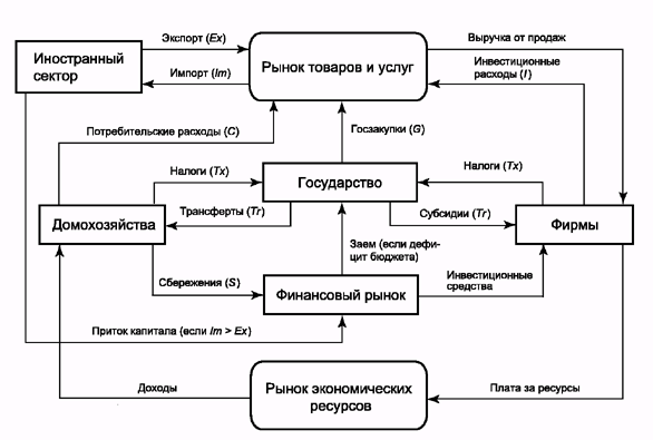 Домохозяйства приобретают товары и услуги (предъявляют спрос на товары и услуги), которые производят и поставляют на рынок товаров и услуг фирмы (обеспечивают предложение товаров и услуг — совокупный продукт). Чтобы производить товары и услуги, фирмы закупают экономические ресурсы — труд, землю, капитал и предпринимательские способности (предъявляют спрос на экономические ресурсы), собственниками которых являются домохозяйства (обеспечивают предложение экономических ресурсов).