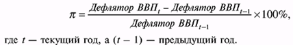 Темп инфляции (π) равен отношению разницы уровня цен (например, дефлятора ВВП) текущего и предыдущего года к уровню цен предыдущего года, выраженному в процентах: