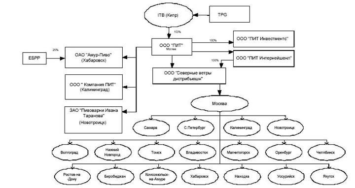 Группа компаний ПИТ – один из наиболее динамично развивающихся лидеров российского рынка пива и безалкогольных напитков. В октябре 2002 года 33% акций группы были проданы инвестиционному фонду Texas Pacific Group (TPG). Структура группы компаний ПИТ приведена в Приложении 4.