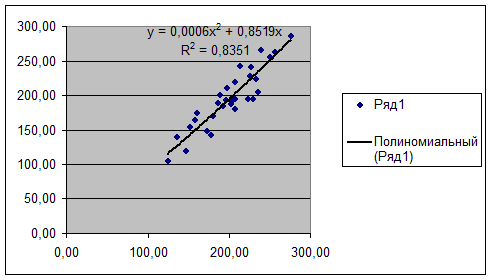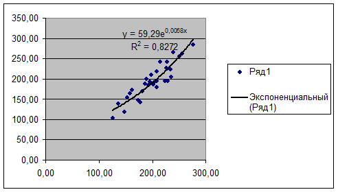 Уравнения регрессии и их графики построены для 4-х видов нелинейной зависимости между признаками и представлены на диаграмме 2.1 Рабочего файла.