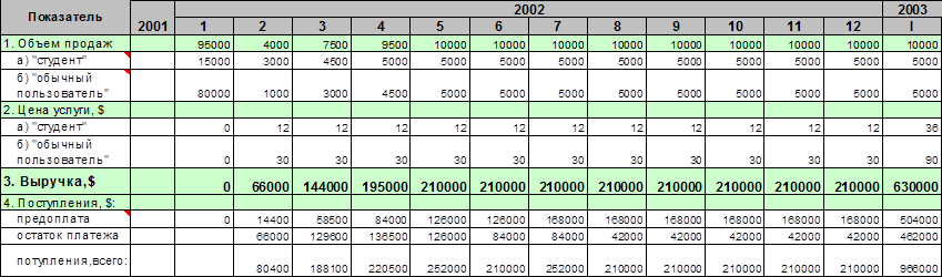 Комментарии: предполагается, что после 6-го месяца 80% пользователей будут работать по предоплате, т.к. абоненты хотят быть уверены, что будут обеспечены услугой на будущее время и поэтому они платят заранее, занимая тем самым себе места.