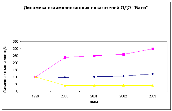 В целом, проанализировав динамику основных показателей ООО «Балс» можно сказать, что с момента своего создания предприятие развивалось достаточно равномерно, произошло увеличение торговых площадей и основных производственных фондов, все анализируемые годы наблюдался рост розничного товарооборота, все это время предприятие было прибыльным и имело неплохой уровень рентабельности, в среднем 8,5%. Однако на конец 2002 году темпы роста по основным показателям снизились, стал расти уровень издержек обращения , в 2002 г. по сравнению с 2000г.он вырос на 11,6 %. Все это говорит о просчетах при принятии управленческих решений.