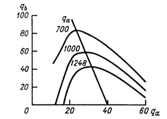 Для наглядного сопоставления равновесия Курно с равновесием Штакельберга линии реакции дуополистов нужно дополнить линиями равной прибыли (изопрофитами). Уравнение изопрофиты образуется в результате решения уравнения прибыли дуополии относительно ее выпуска при заданной величине прибыли. По данным примера 4.7 на рис. 4.32 построены изопрофиты и линия реакции фирмы А. Чем ниже расположена изопрофита, тем большему размеру прибыли она соответствует, так как ее приближение к оси абсцисс соответствует росту qa и уменьшению qb.