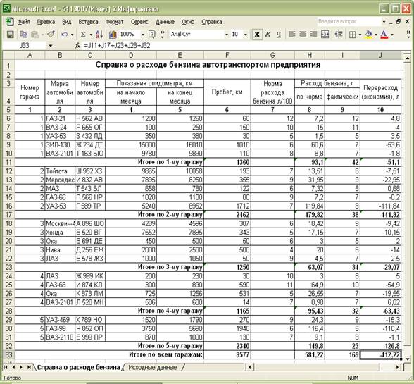 2. Таблица 2 должна содержать итоговые данные по каждому гаражу и общие итоги в графах 6, 8, 9, 10.