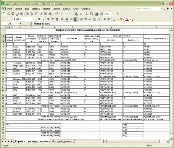 Скопируем исходные данные в таблицу «Справка о расходе бензина автомобилями предприятия».