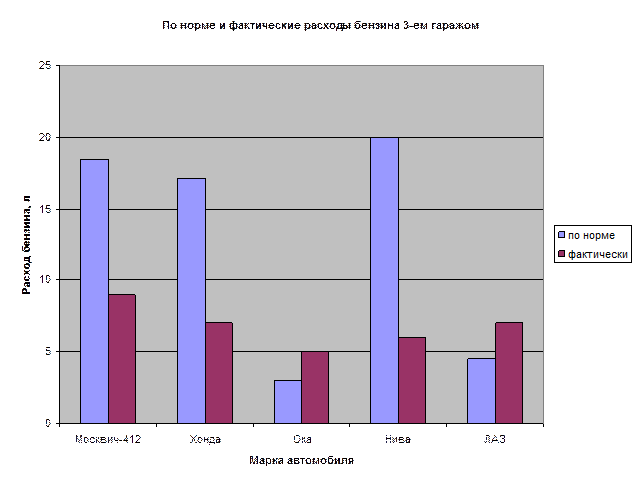 3. Построить столбиковую диаграмму расхода бензина по норме и фактически одним гаражом предприятия (любым).
