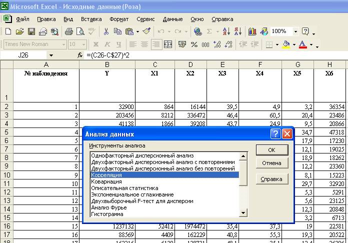 2. В диалоговом окне Анализ данных выберем инструмент Корреляция. Таблица 1