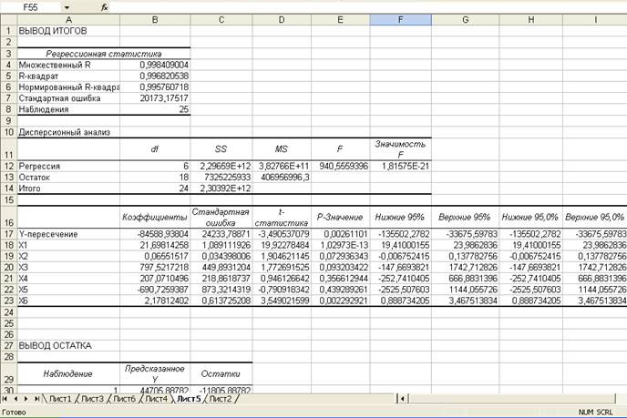 Действие первое. Х5 исключаем, т.к. он не значим (-690,726<t-табл.=2,068655).