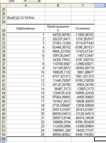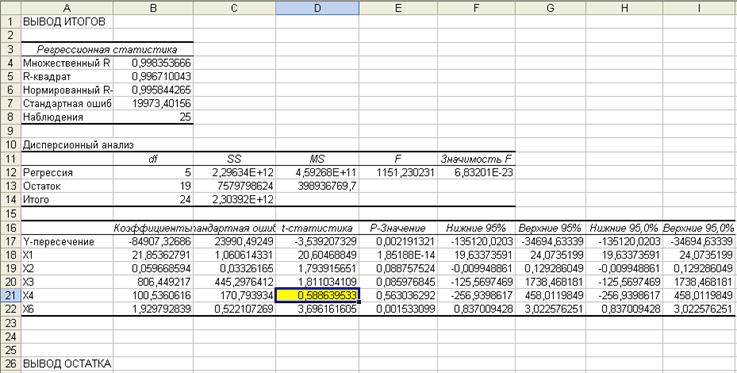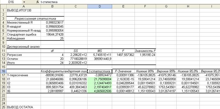 Во втором столбце таблицы 5 содержатся коэффициенты уравнения регрессии а0, а2, а3 а4. В третьем столбце содержатся стандартные ошибки коэффициентов уравнения регрессии, а в четвертом – t – статистика, используемая для проверки значимости коэффициентов уравнения регрессии. Уравнение регрессии зависимости у от х можно записать в следующем виде:
