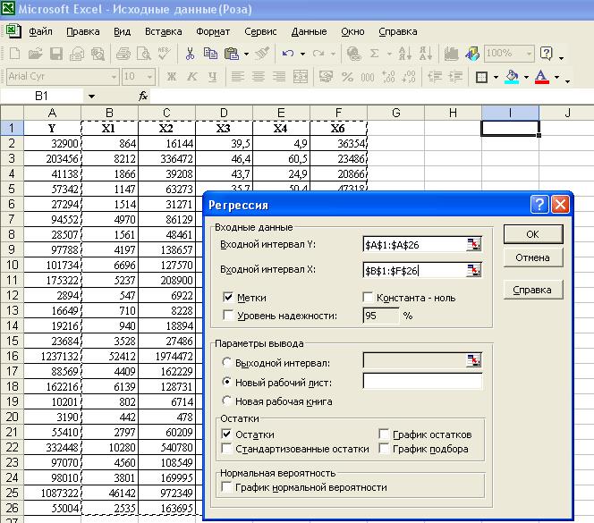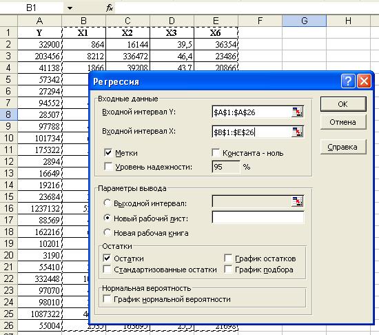 3. В диалоговом окне Регрессия в поле Входной интервал Y вводим адрес одного диапазона ячеек, который представляет зависимую переменную. В поле Входной интервал X вводим адреса диапазонов, которые содержат значения независимых переменных.