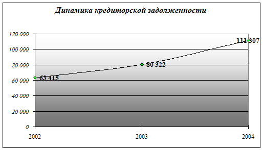 В ходе проведенного анализа дебиторской и кредиторской задолженности на ООО «ЧТЗ - Уралтрак» наблюдается увеличение с каждым годом кредиторской задолженности. По сравнению с 2002 годом кредиторская задолженность на 01.01.2004 года увеличилась на 47 892 тыс. руб. Сравнивая дебиторскую задолженность за три года наблюдается сокращение обязательств дебиторов лишь в 2003 году, но вместе с тем происходит резкое увеличение в 2004 году по сравнению с 2003 на 65 608 тыс. руб.