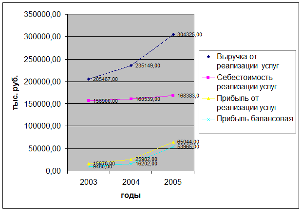 2) себестоимость услуг выросла с 156900 до 160539 руб. в 2004 году и с 150639 до 168383 руб. в 2005 году по сравнению с 2004 годом