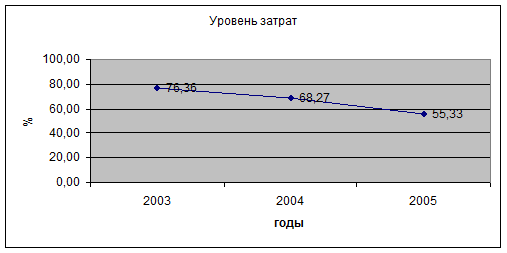 Как видно из рисунка 3, в 2004 году уровень затрат организации упал с 76,36 % до 68,27 %. А в 2005 году произошло падение уровня затрат до 55,33 %.