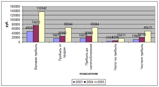 5) выручка от реализации в 2004 году выросла с 205467 до 235149 руб. по сравнению с 2003 годом и с 235149 до 304325 руб. в 2005 году по сравнению с 2004 годом;