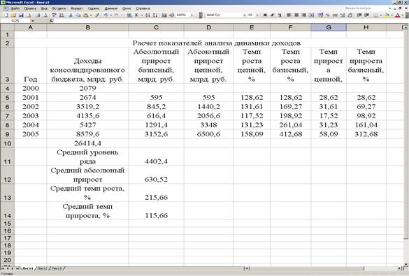 Расчеты показателей динамики доходов государственного бюджета РФ выполнены с применением прикладного пакета программ обработки электронных таблиц MS Excel в среде Windows.